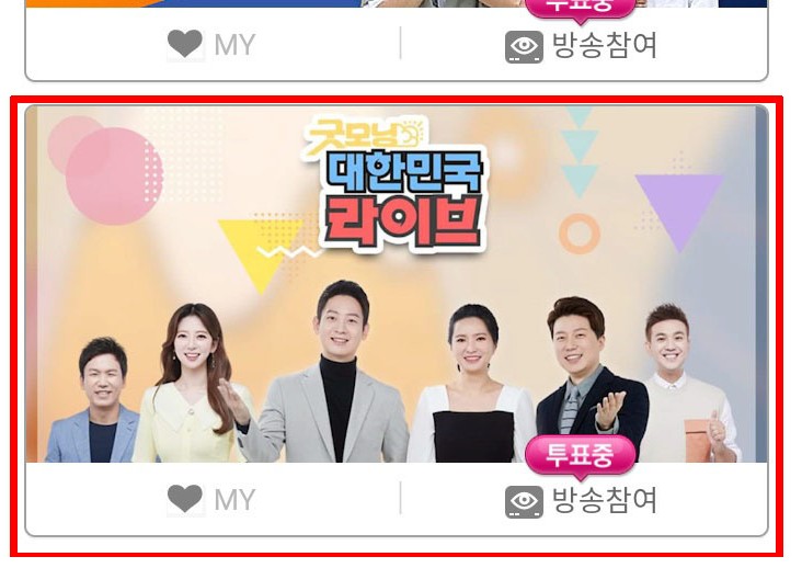 위와같은 앱을 다운로드 받으세요. 해당앱을 설치하면 바로 배너창으로 굿모닝 대한민국 라이브 배너창을 확인하실 수 있습니다.